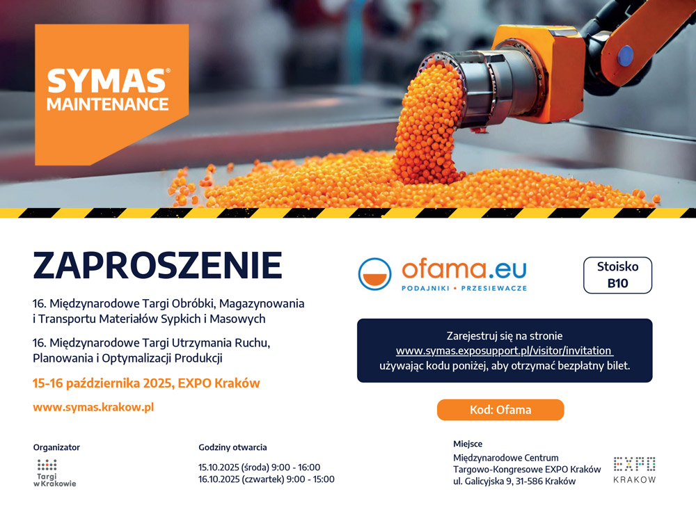Firma OFAMA serdecznie zaprasza na 16 Międzynarodowe Targi Obróbki Magazynowania i Trasportu Materiałów Sypkich i Masowych SYMAS w Krakowie które odbędą się w dniach 15-16.10.2025r.